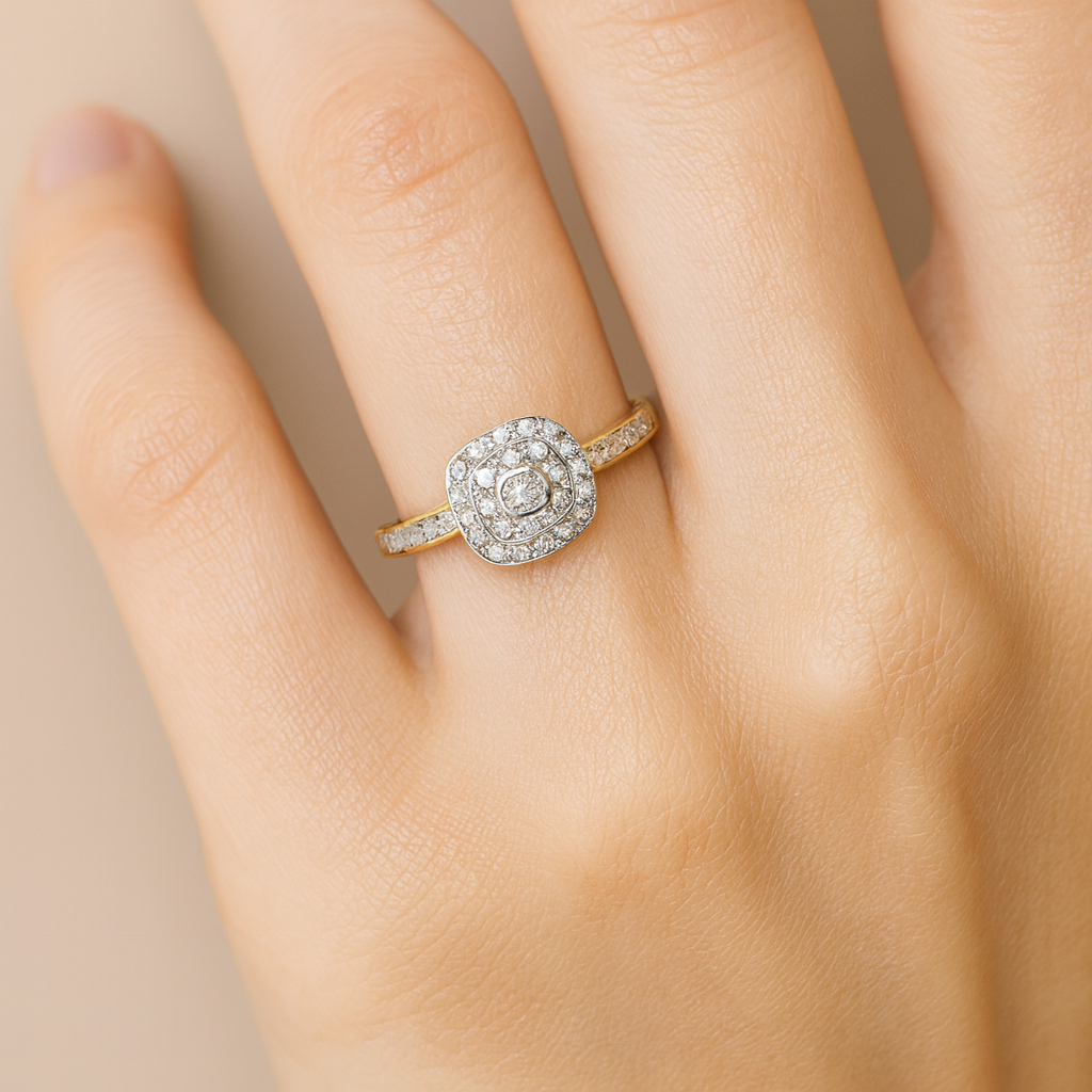 The ring is a two-tone halo-style design crafted primarily in polished yellow gold. Its band is slim and elegant, with small round-cut stones embedded along the shoulders, adding extra sparkle. At the center, the ring features a square-shaped halo with softly rounded corners. Inside the halo are two concentric rows of clear, brilliant-cut stones surrounding a single central stone. The white metal setting for the halo contrasts beautifully with the yellow gold band, making the diamonds stand out vividly. This design creates a luxurious, vintage-inspired look while maintaining a modern and sophisticated feel—perfect for special occasions or as a statement accessory.