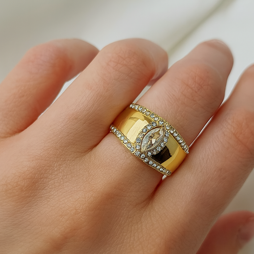 The ring is a wide-band gold-plated statement piece featuring a luxurious and eye-catching design. At its center, a marquise-cut clear gemstone is vertically set, framed by a halo of small round crystals that amplify its sparkle. Two parallel rows of pavé-set crystals run along the top and bottom edges of the band, creating a balanced, elegant border. The band itself is polished to a high-shine finish, giving it a reflective, mirror-like surface that contrasts beautifully with the surrounding stones. Its bold width and detailed embellishments make it ideal for glamorous occasions or standout everyday wear, blending vintage-inspired sophistication with contemporary styling.