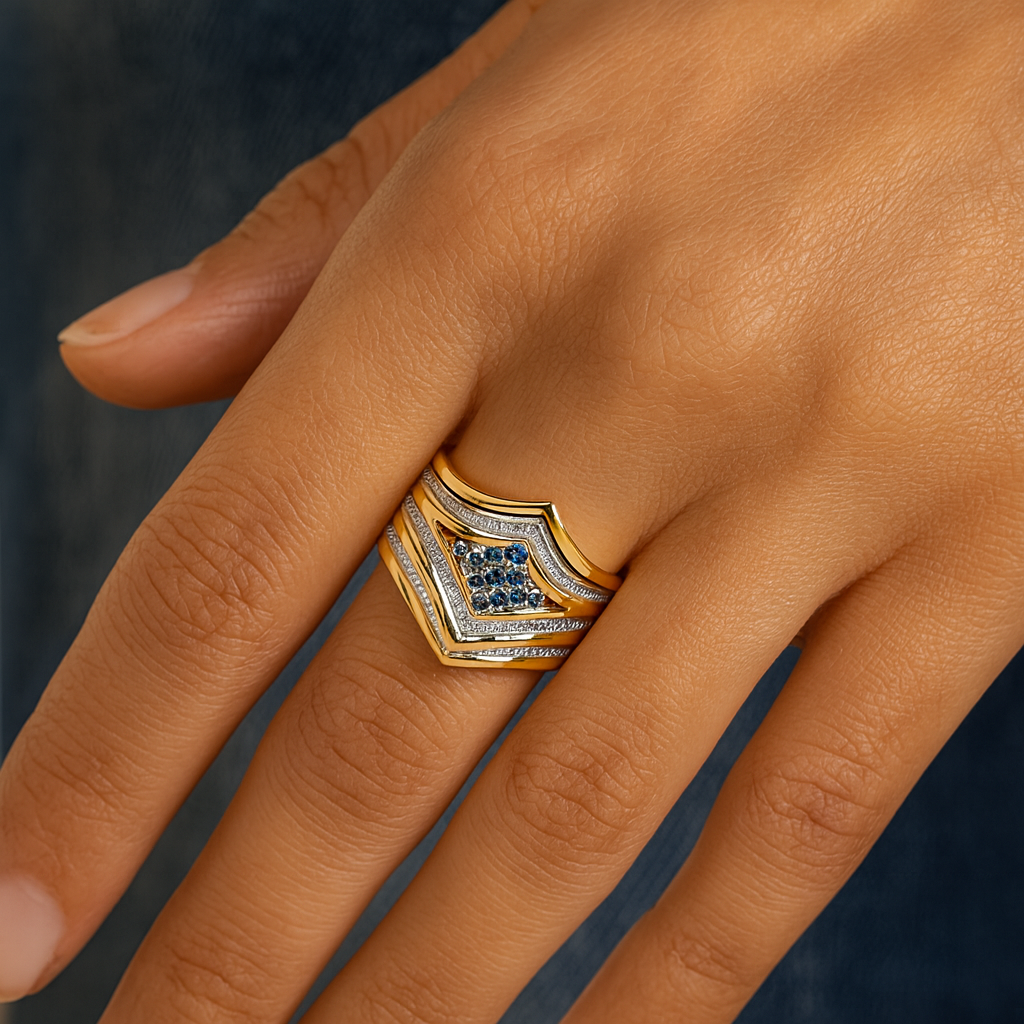 The band forms a distinctive chevron or V-shape, which gives it a unique and modern edge while adding elegance to the finger. The blue cluster is framed by rows of sparkling clear stones set in white gold, bordered with delicate bead-like accents that enhance the brilliance and depth of the design. The ring combines the richness of yellow gold with the cool sparkle of white accents and the striking pop of blue stones, creating a luxurious, sophisticated, and eye-catching piece. It’s perfect for someone who wants jewellery that blends classic richness with a modern, standout style.