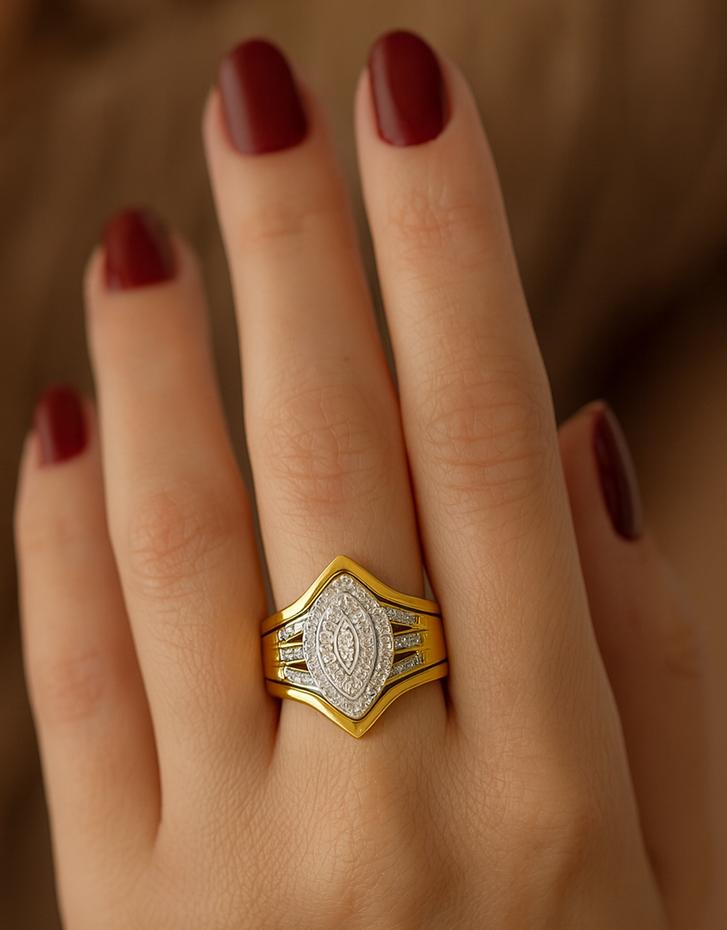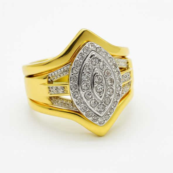 This triple-set marquise ring showcases a bold and luxurious design, crafted in gleaming yellow gold with striking white gold accents. The centerpiece features a marquise-shaped cluster of brilliant-cut stones, framed by two shimmering halos that enhance its depth and sparkle. The split shank design is embellished with additional pavé-set stones, adding to its brilliance and sophistication. Its layered construction and intricate detailing give it a regal, statement-making presence—perfect for those who want a ring that exudes elegance and grandeur.