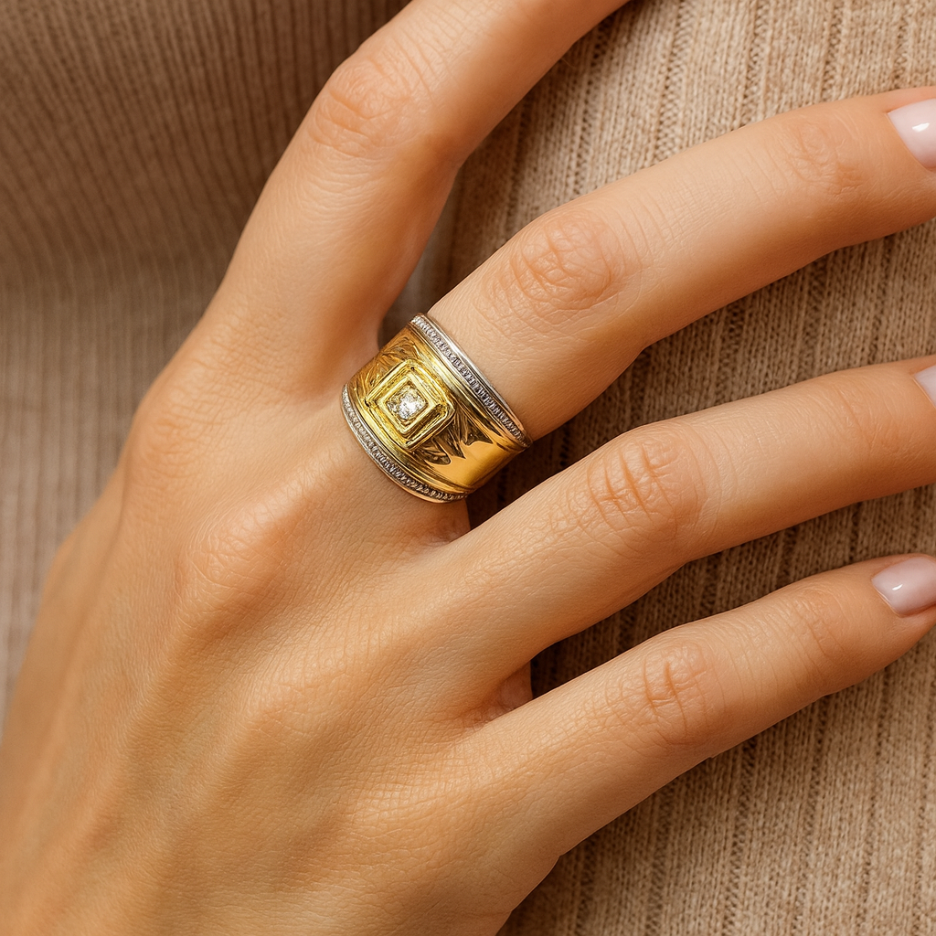 The ring is a bold and stylish two-tone design that combines gold and silver finishes. Its wide band features a striking centerpiece: a square-set clear stone framed with a beaded border that adds depth and texture. The gold portion of the band showcases engraved triangular patterns radiating out from the center, giving it a strong, structured look. Both the top and bottom edges are accented with silver detailing, set with small sparkling stones that add extra brilliance and contrast. Overall, it’s a statement ring with a mix of luxury, sophistication, and eye-catching craftsmanship.
